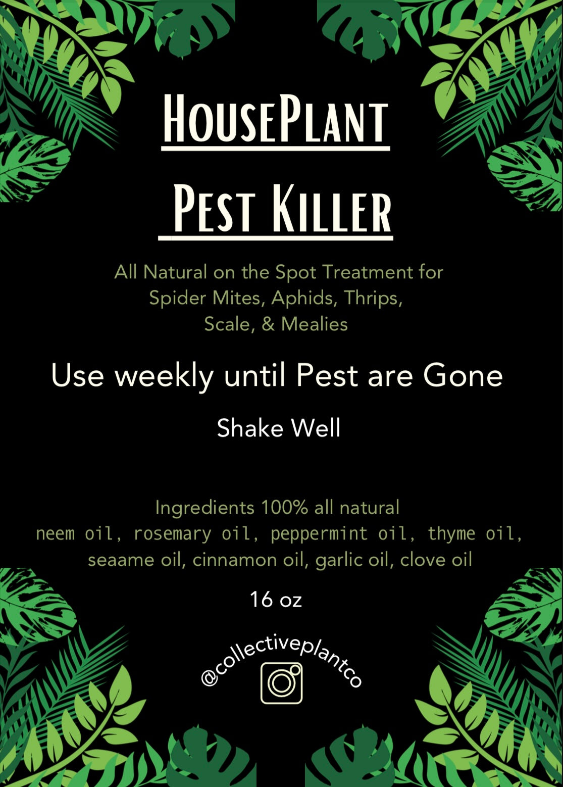 Formulated naturally and non-toxic to humans, our Houseplant Pest Killer can get rid of the most common pests quickly! Treats Spider Mites, Aphids, Thrips, Scale and Mealybugs 16 oz All natural ingredients: neem oil, rosemary oil, peppermint oil, thyme oil, sesame oil, cinnamon oil, garlic oil, clove oil.
