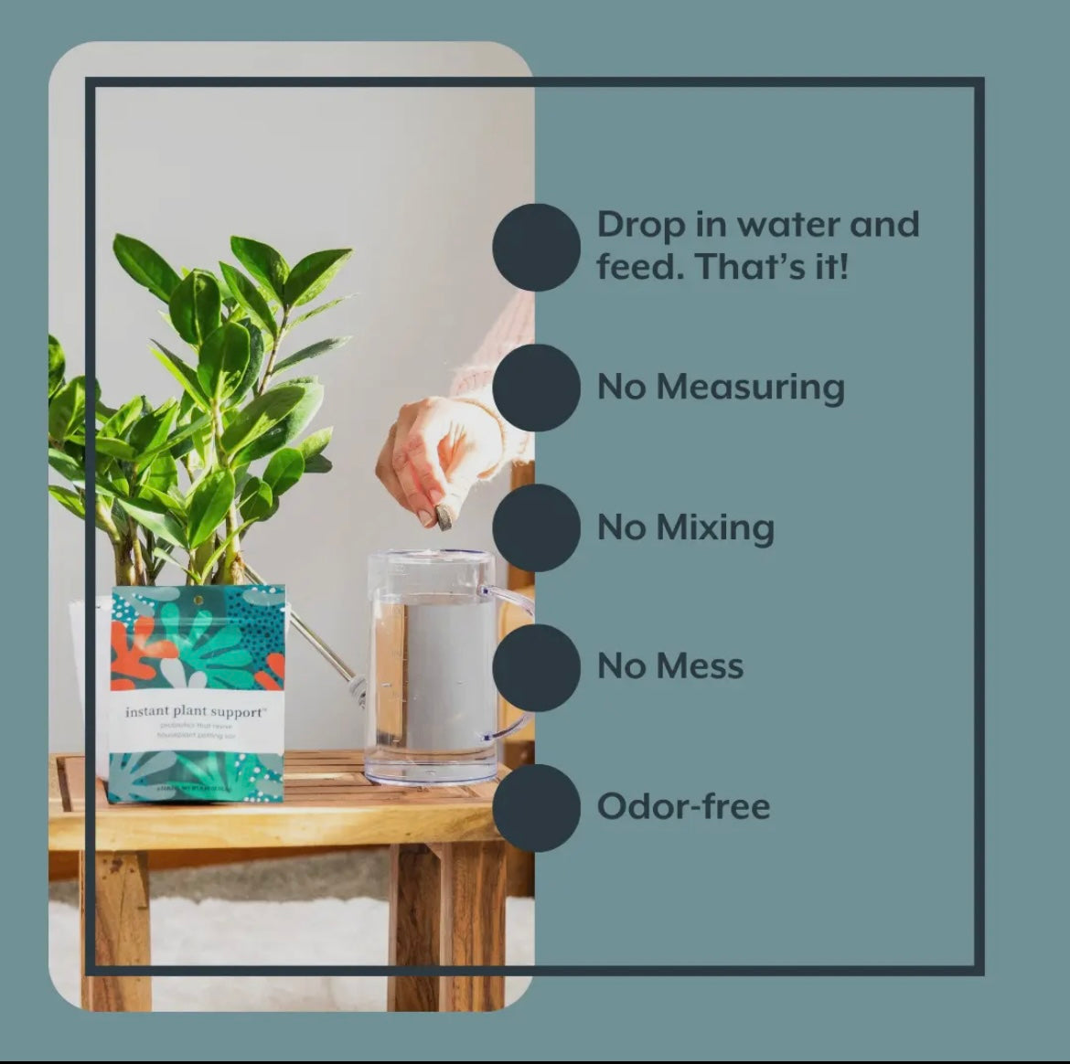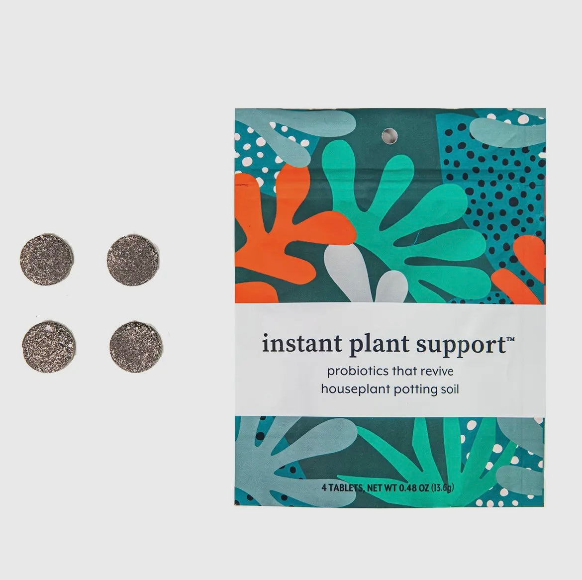 Instant Plant Support™ - Potting Soil Revitalizer, Dissolvable SOIL PRO-BIOTIC tablets crafted with beneficial soil microbes, humic acids, and other natural ingredients to improve potting soils. Conveniently packaged, pre-portioned, odorless. No measuring. No mixing. No mess. Great with any plant purchase or a great gift. Beautiful branding and eco-friendly company values.